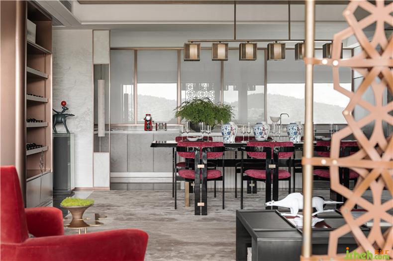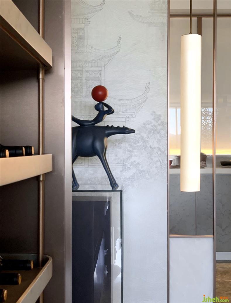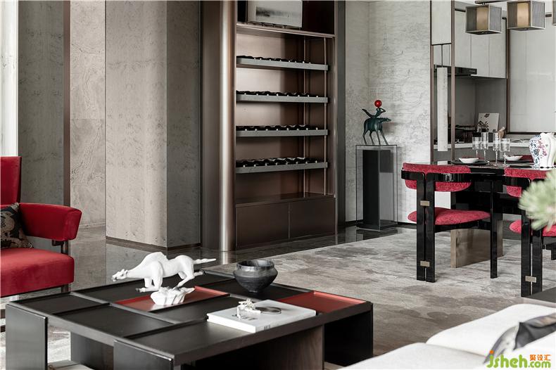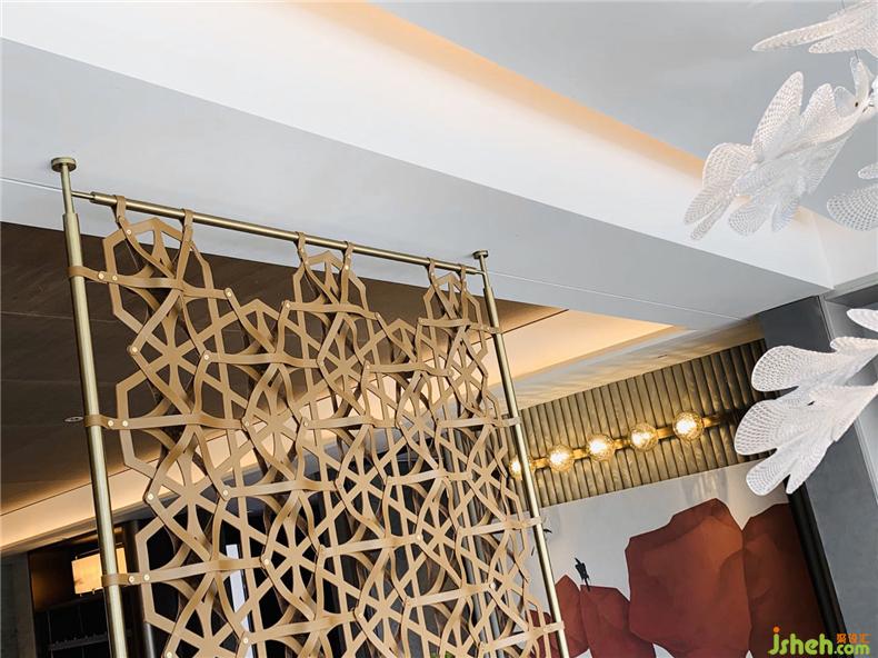 在客廳與陽臺開放相連處,有一扇藝術屏風,樣板房設計其靈感來自貴州當?shù)氐娜胫窬?。但設計師把筆鋒一轉,利用皮質材料構筑出這扇兼具藝術與時尚語匯的編織屏風,通過不同的材質回應了城市的地域特色。