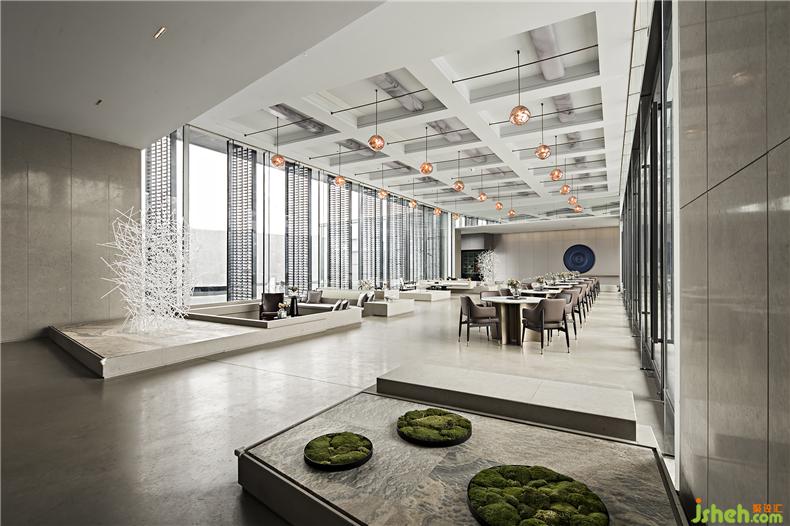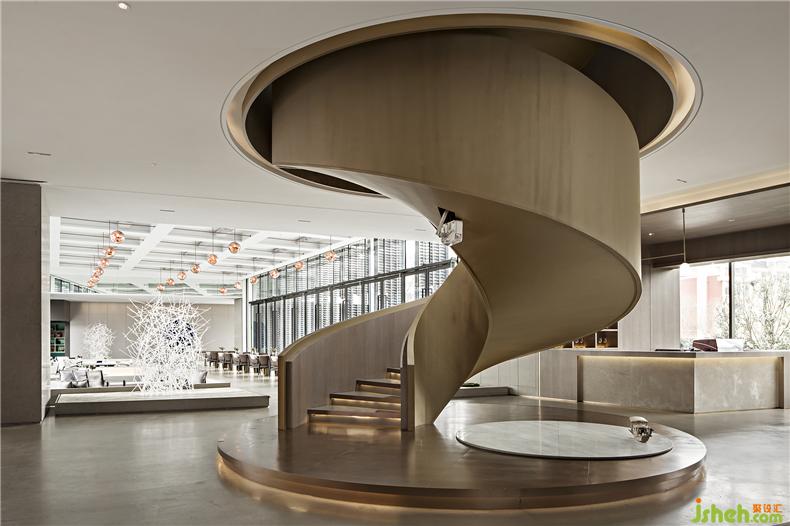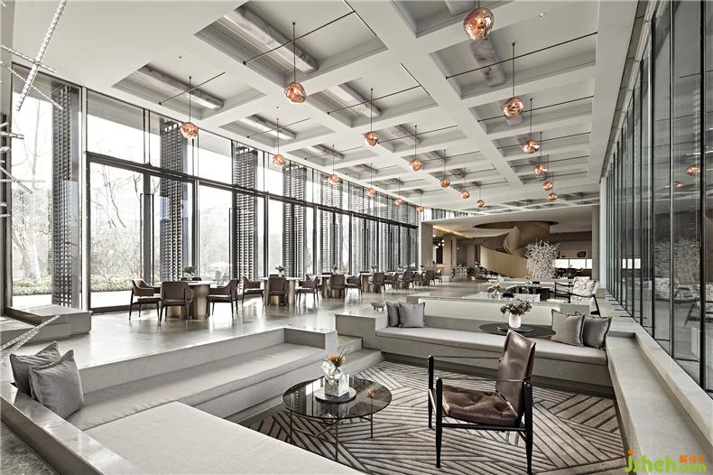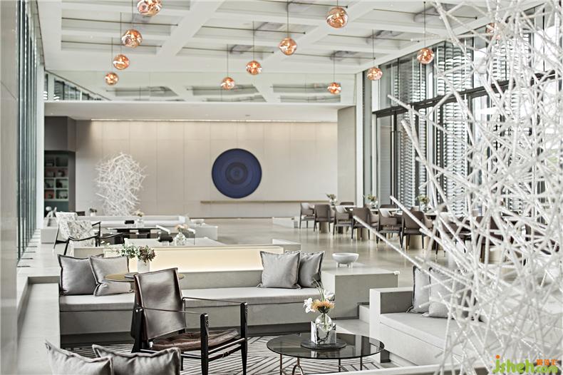 金屬、琉璃、石材巧妙組合運(yùn)用,勾畫(huà)出晶瑩剔透的意境。自然光線(xiàn)傾灑入室內(nèi),玻璃等通透的材料能與光線(xiàn)產(chǎn)生美妙的交互,明暗交錯(cuò)如水面漣漪反射的光影斑駁。大廳的設(shè)計(jì)過(guò)濾了來(lái)自于外界的繁復(fù),而液態(tài)的樹(shù)脂則凝固成想要的形狀,零星點(diǎn)綴在空間中。每一隅角落安置的藝術(shù)擺件都充滿(mǎn)巧妙的用意,空間立刻充盈無(wú)形的柔軟的力量,穿梭其中的訪(fǎng)客仿若能傾聽(tīng)到潺潺水聲。室內(nèi)設(shè)計(jì)師