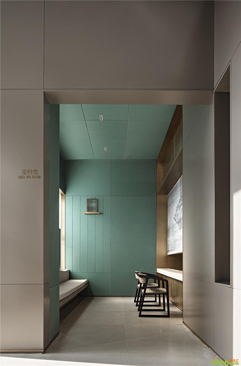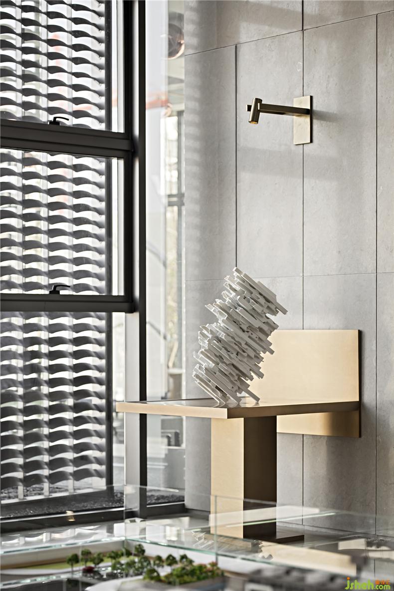 隨藝術(shù)導(dǎo)向行至?xí)涂臻g,大篇幅留白、灰色與木質(zhì)完美結(jié)合,點(diǎn)綴其中的傳統(tǒng)中國色彩盒子,以及玻璃裝置,皆如沉入一汪清淺池中。巨大的金屬螺旋樓梯的鮮明特質(zhì)在精心設(shè)計(jì)下顯得非常令人矚目,從上而下的流動(dòng)隱喻著相對(duì)的熱鬧,與身處的靜謐空間形成巧妙對(duì)比,相互矛盾卻又順勢而為。室內(nèi)設(shè)計(jì)師