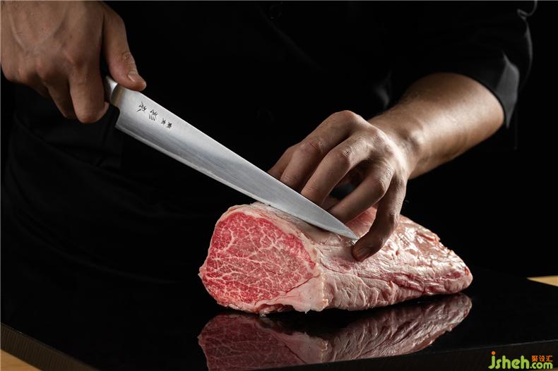 一塊漆黑的墻面銜接玻璃幕墻,沒有任何花俏的圖案或特殊的紋理裝飾,只有金銅色的店名提醒來訪者,火燒鋼板背后藏著整個(gè)美味和牛燒肉世界。