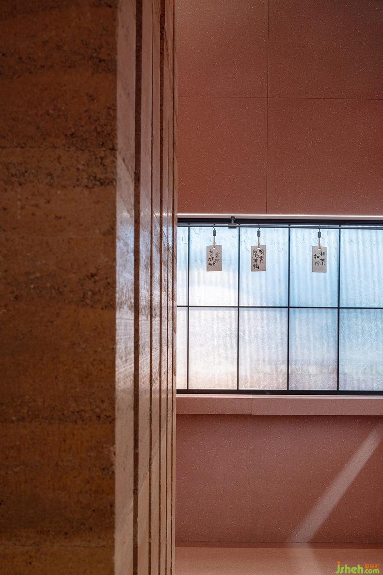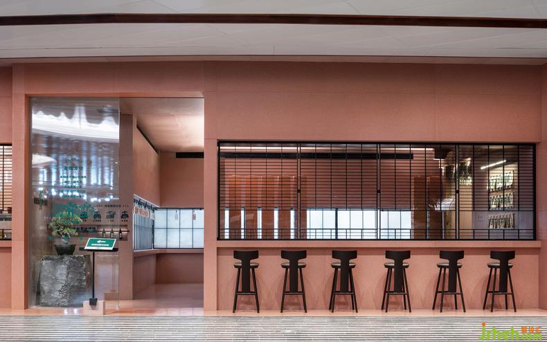 點餐處的玻璃窗上,亦隱現(xiàn)障子紙的天然紋路,經(jīng)過現(xiàn)代處理后可自動伸縮;餐廳設(shè)計懸掛其上的菜牌用毛筆書寫而成,于細(xì)微處又營造出時下逗趣的輕松感