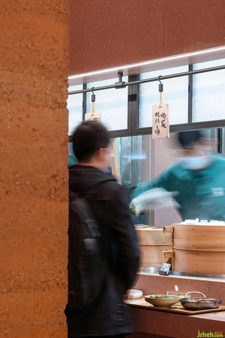 為了迎合都市客們追求化繁為簡、精巧智慧的生活態(tài)度,餐廳就餐采取全自助模式,餐廳設(shè)計室內(nèi)空間據(jù)此設(shè)置L型長廊,食客們?nèi)〔途?、選餐、支付的過程中可通過明檔式廚房看到新鮮菜品出爐