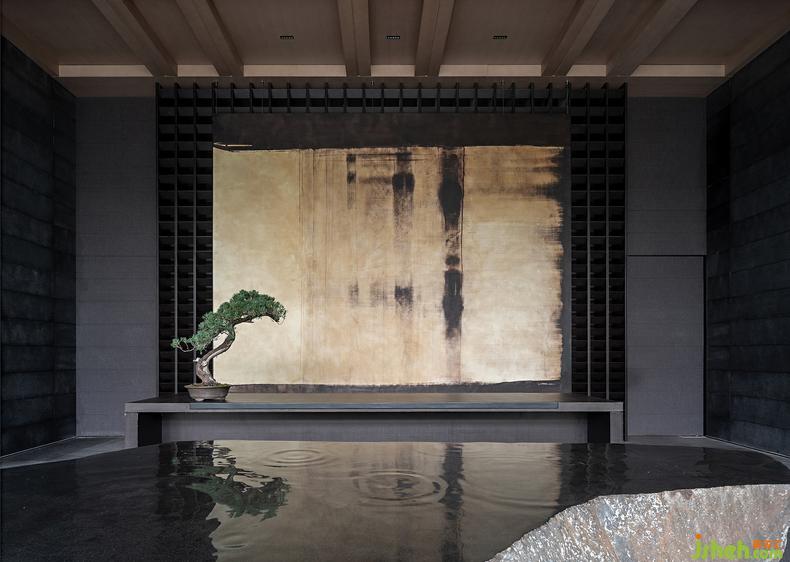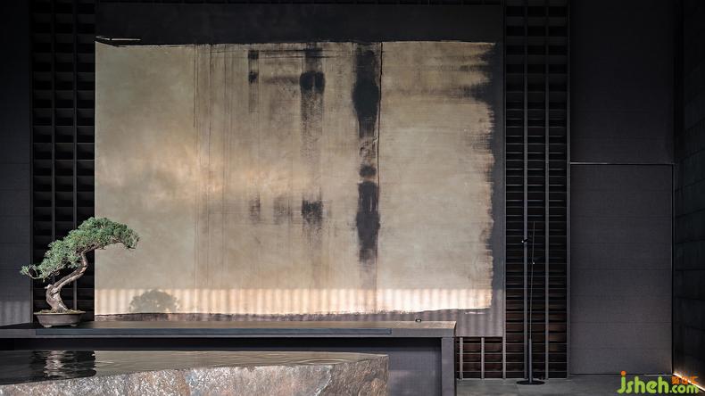 在這般滴翠的綠意中,掩映著一座與庭院共生的“閣子”,由深灰色格柵圍構(gòu)起的建筑去掉一切多余,被抽象為最簡(jiǎn)凈的線條和空間,摒棄矯飾反得一種純粹的哲思,這樣的空間精神也讓人自然生出返觀內(nèi)省的安靜。因?yàn)樾撵o下來(lái),感知與思考也被無(wú)限放大,于是使用透光障子的天花將自然光引化為“光陰的故事”——古人說(shuō)時(shí)間是光陰,這其中已然含有明暗交替的空間感。會(huì)所設(shè)計(jì)再加上庭院里通過(guò)格柵透入的自然光,這個(gè)空間竟然又將時(shí)間凝固了。身在其中,不論是靜立或徜徉,都如在閱讀歷史的詩(shī),觸摸當(dāng)代的云,浴沐湖面的風(fēng),是五感交織的神游。