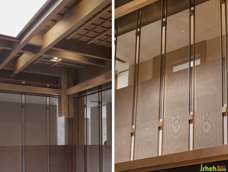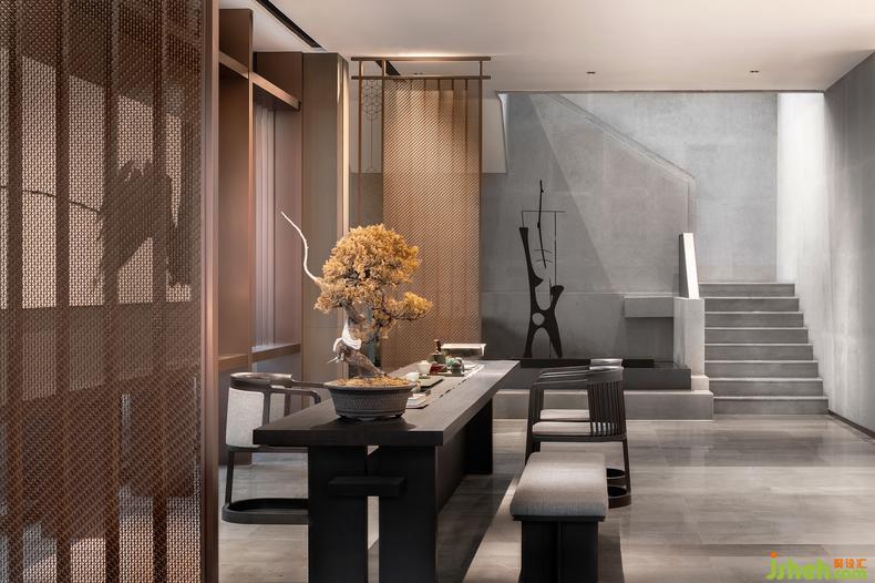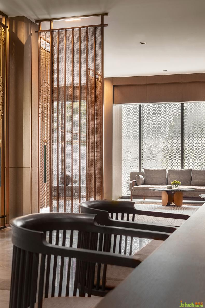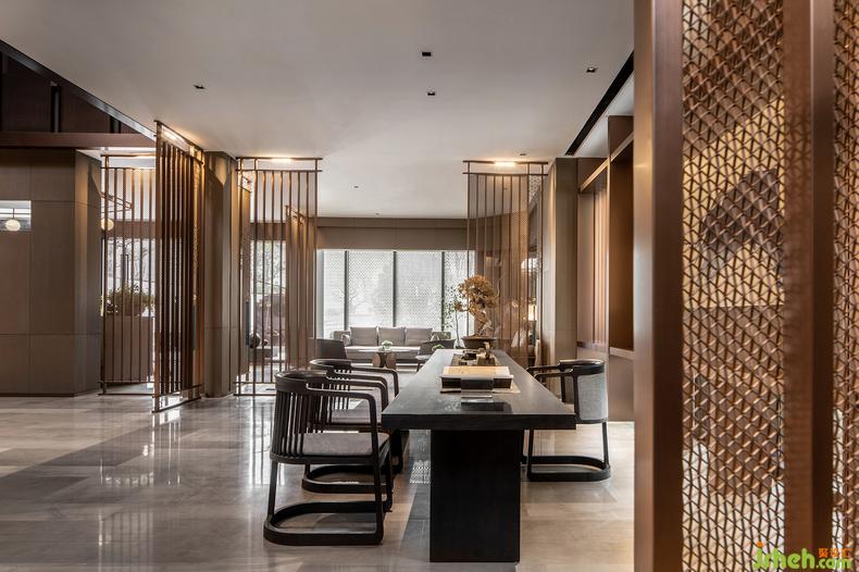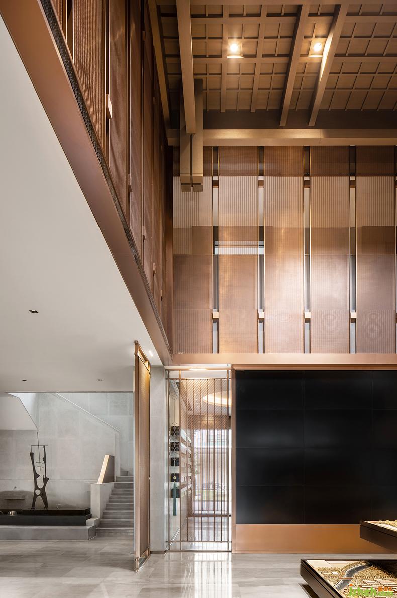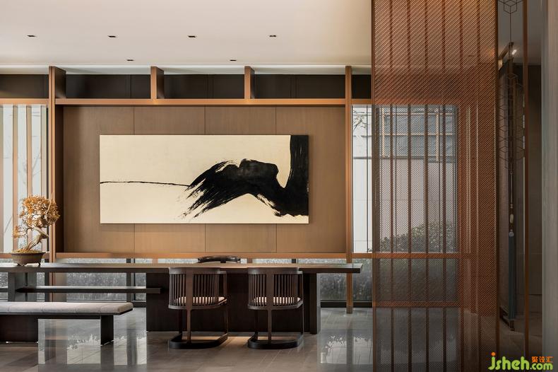 無處不在的鏤空屏風(fēng)與淺灰障屏,利用光影的游戲,在室內(nèi)構(gòu)筑出一方方東方式的朦朧幽玄的空間。一道道“屏風(fēng)”,遠(yuǎn)看似雅致的雕花槅扇,實(shí)則采用了金屬材質(zhì),在古典意境與當(dāng)代質(zhì)感之間玩味出時(shí)間的新韻。屏風(fēng)上有著豐富紋樣變化的網(wǎng)格與花格,放室外光線微明地滲入,銷售中心設(shè)計(jì)賦予空間中的畫作和藝術(shù)品以閑寂與深靜。而當(dāng)光與影的嬉戲隨著時(shí)間轉(zhuǎn)移,屏風(fēng)不動(dòng)聲色地對整個(gè)空間做出了更婉轉(zhuǎn)細(xì)致的區(qū)隔,帶來移步換景般的視覺體驗(yàn),也為《世說新語》中“從山陰道上行,山川自相映發(fā),使人應(yīng)接不暇”的名句,添上了幾分現(xiàn)代的注腳。
