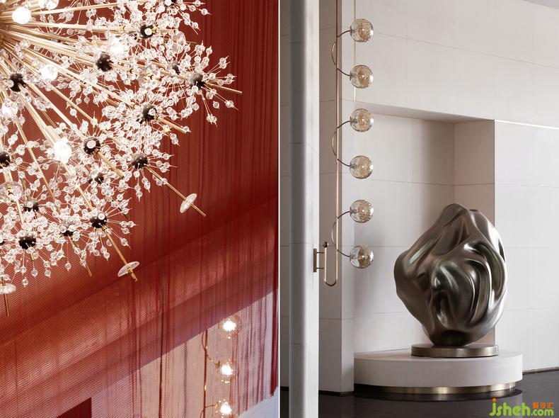 初步入,敞闊的接待前廳便以它的大尺度回應(yīng)了這片天地的朗然。金屬格柵式屏風(fēng)與米灰色天然石材的對(duì)撞,仿佛人工與自然、現(xiàn)代與傳統(tǒng)的勾連,而一盞“日不落”式裝置的加入,則與這里遲遲不肯落幕的太陽(yáng)相互輝映,如同永不墜落的生命之光,用藝術(shù)點(diǎn)亮了整個(gè)空間。生活館設(shè)計(jì)而另一側(cè)存在感顯著的空間雕塑則汲靈感自大風(fēng)吹皺的綢緞動(dòng)態(tài),不正是千年前絲路上的美妙一瞬。