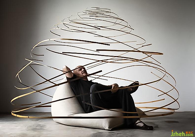 △洛朗 ·馬丁 ( LAURENT MARTIN ‘L O ’ ),生于1955年, 巴黎, 法國,他的竹品雕塑帶觀者進入三維空間,他的作品猶如反重力般懸掛半空,隨著空氣的流動不息地旋轉(zhuǎn)。雕塑在空中擺動勾劃出和諧優(yōu)美的曲線,餐廳設(shè)計宛如中國書法的筆法般自然流暢,一筆一勾都帶著無比優(yōu)雅。