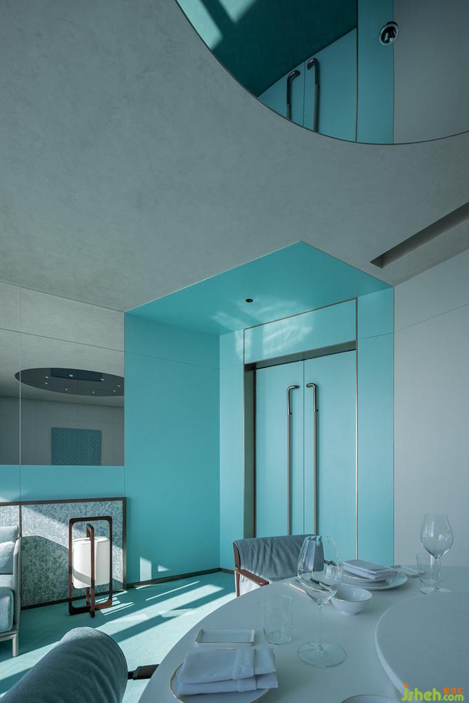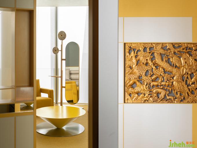 “黃”,既是傳統(tǒng)陰陽(yáng)五色學(xué)系中最為尊貴的色彩,也是頂級(jí)奢侈品牌衷睞的金色時(shí)尚經(jīng)典。借助視覺(jué)語(yǔ)言與朝向?qū)傩浴⒐庥白兓?、角度關(guān)系的整合考量,空間隨時(shí)間的推移而變換生動(dòng)的表情,被夕陽(yáng)似暈輪浸染時(shí)尤佳。洋溢的色彩與幾何模塊式結(jié)構(gòu)連貫為極簡(jiǎn)語(yǔ)言序列,潮汕匠人純手工創(chuàng)作的金漆木雕則與之重組文化密碼。