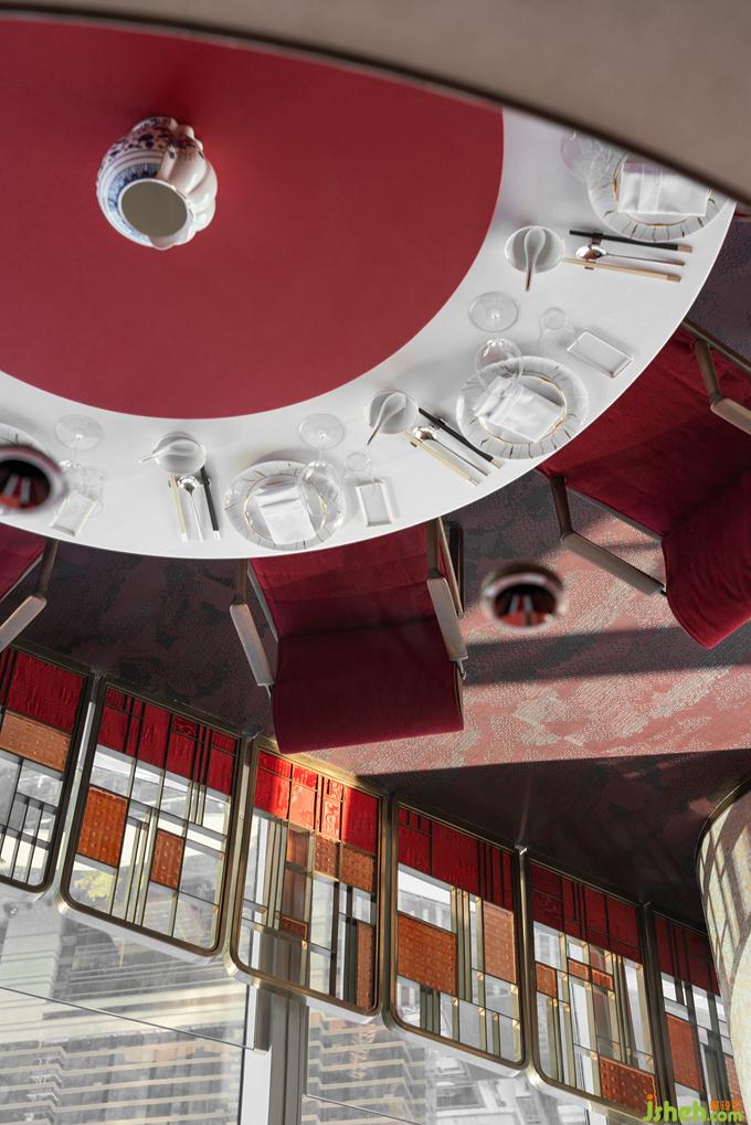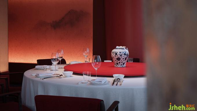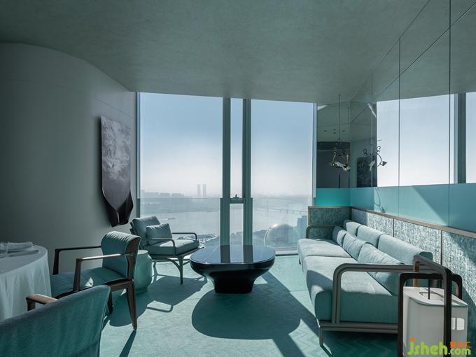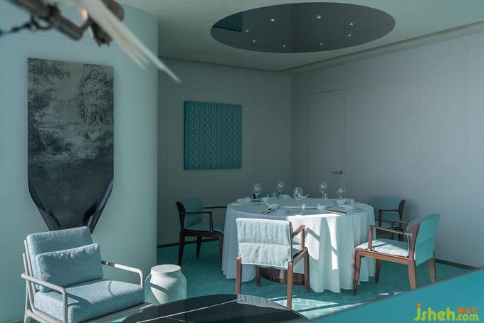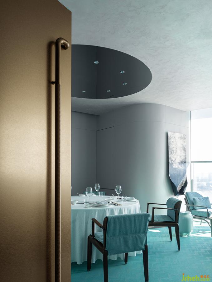 《釋名》說“青,生也,象物生時(shí)色也”。作為東方正色的“青”,蘊(yùn)涵著萬物萌發(fā)的無限生機(jī)。杭州餐廳設(shè)計(jì)不同明度和色階的青色如水彩般濡濕、浸透、調(diào)和于空間體塊和家具系統(tǒng)中,由外及里構(gòu)成天成地接的階梯式遞進(jìn)氛圍。動(dòng)線中視覺落點(diǎn)的裝置器物,則以抽象重疊的褶皺與紋理勾勒細(xì)部精微之美,鏡面的穿插運(yùn)用亦帶來視錯(cuò)觀照的多重意趣