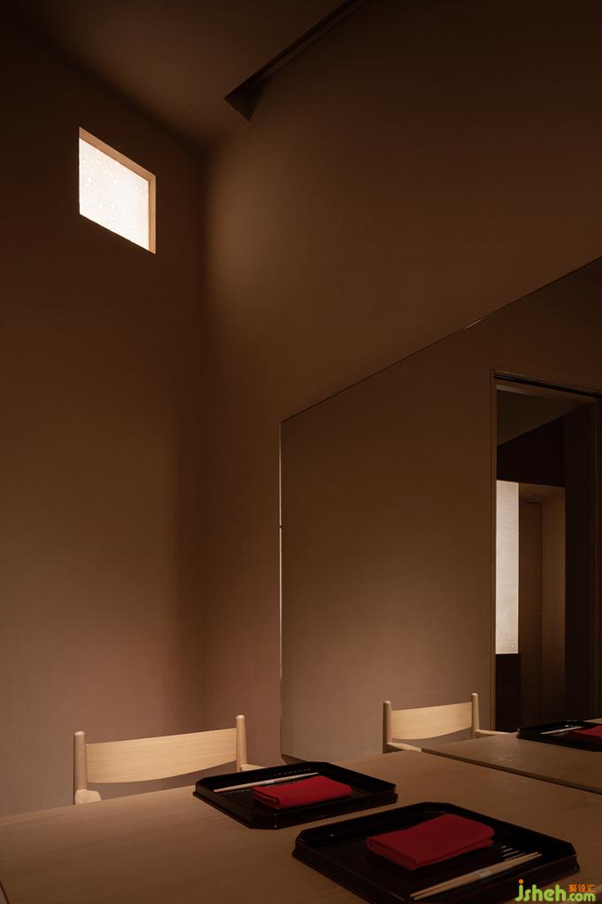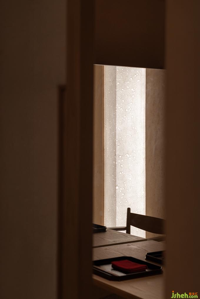 日本料理設(shè)計用光的克制也如繪畫的留白,廊道里只剩下微弱的光線指引著方向,餐廳設(shè)計駐足停留之處便任由光線透過和紙柔和地暈開,遠近高低,變換著點、線、面的形態(tài),實驗性地試探著人與物的關(guān)系。