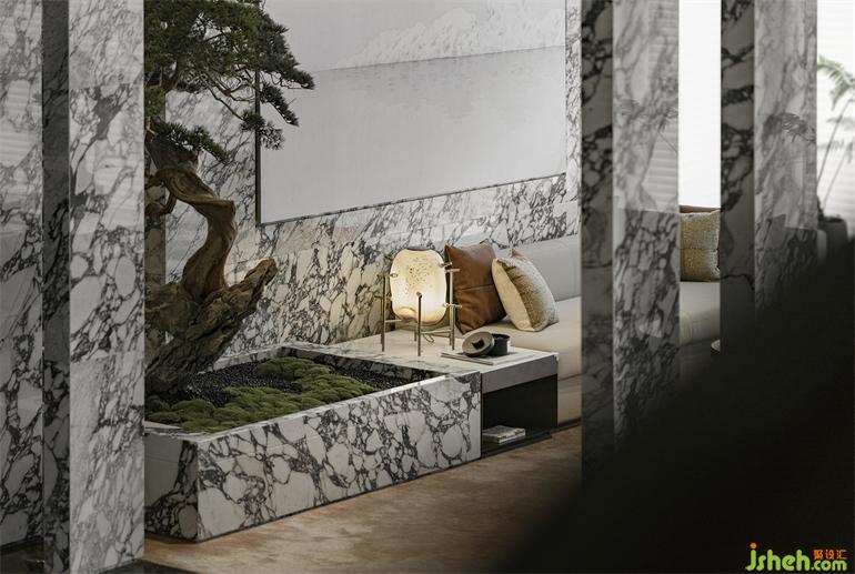 VIP室則更突出私享感,張力十足的藝術(shù)品在私密的空間中形成強(qiáng)大氣場(chǎng),美學(xué)館設(shè)計(jì)如詩社般氤氳的空間氛圍自帶高階的沉靜。來自揚(yáng)州的精致工藝在此被藝術(shù)化地呈現(xiàn):印刷雕版、絹布刺繡,還有詩歌的在地性都化作設(shè)計(jì)的詞匯,被寫進(jìn)這首短詩里。