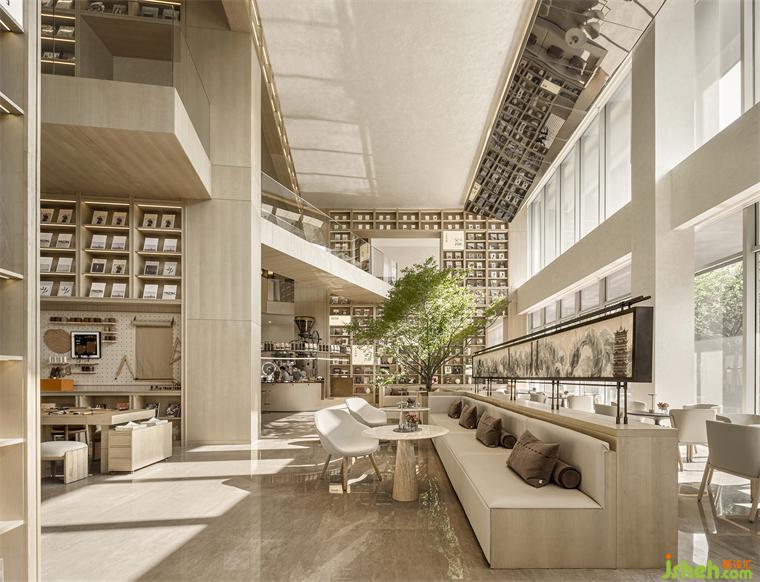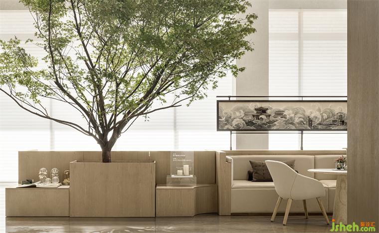 徜徉在昆明綠城&德潤(rùn)柳岸曉風(fēng)生活館中,一種“城市之中,游林之外”的意趣伴隨始終。入口處的接待區(qū),收束的空間起到了引入的作用,這里閑雅寧和的木色調(diào)與中性色調(diào)在金屬、石材和木材的協(xié)奏中表達(dá)了整個(gè)設(shè)計(jì)的主題——書香趣游。靈活的建筑體塊將挑高充裕的空間進(jìn)行了得宜且活潑的排布調(diào)動(dòng),在圖書館式的高闊書墻背景下,室內(nèi)設(shè)計(jì)師甚至形成了一、二層的動(dòng)線互文。至于書墻上那幅如手卷般橫向展開的藝術(shù)畫作則進(jìn)一步勾起“游人”的好奇,引人“緣溪行”,繼而忘路之遠(yuǎn)近。