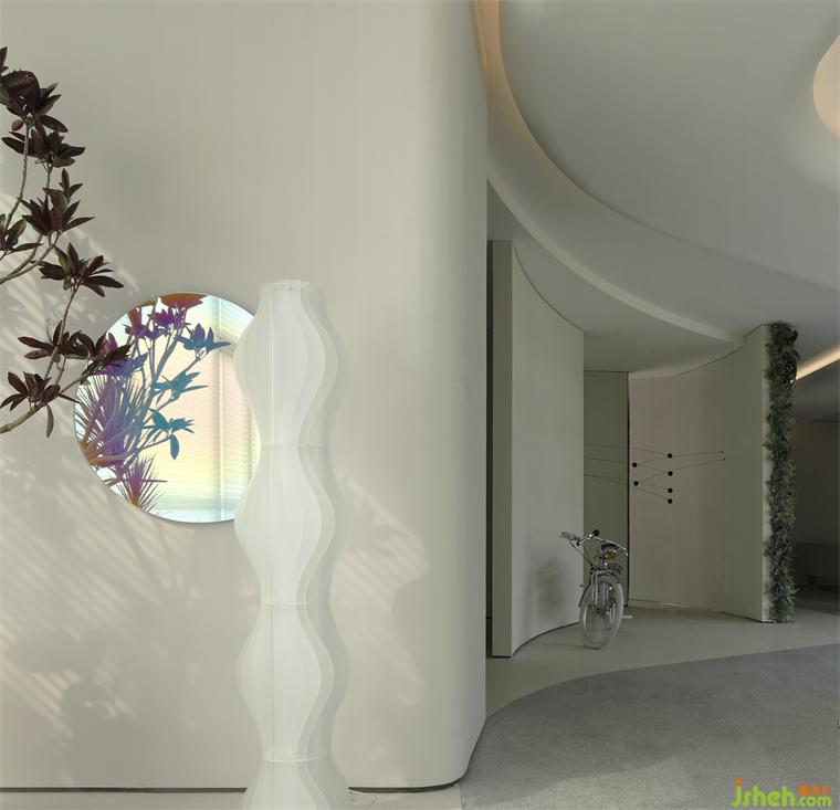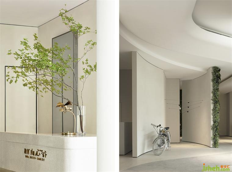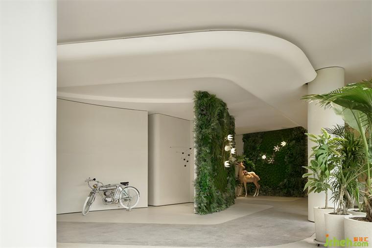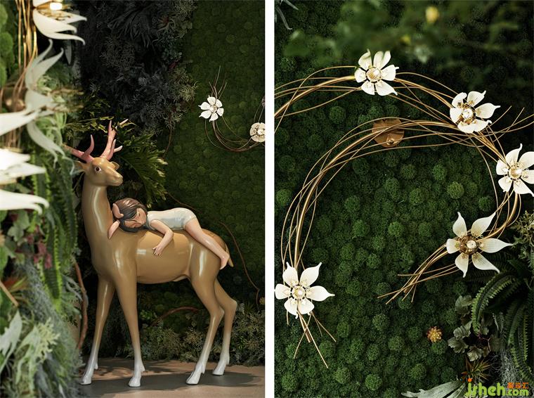兩面花藝肌理的綠植墻,語調(diào)清新,青苔、花朵、室內(nèi)設計師和林間散步的小鹿,皆以藝術化的表現(xiàn)形式成為空間的一部分,呼應了所處的自然溪谷絕妙的自然氛圍,成為了空間的主導。
