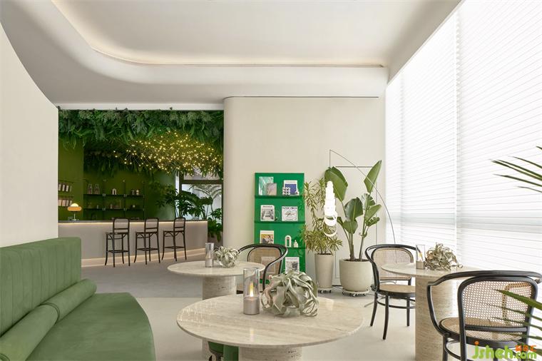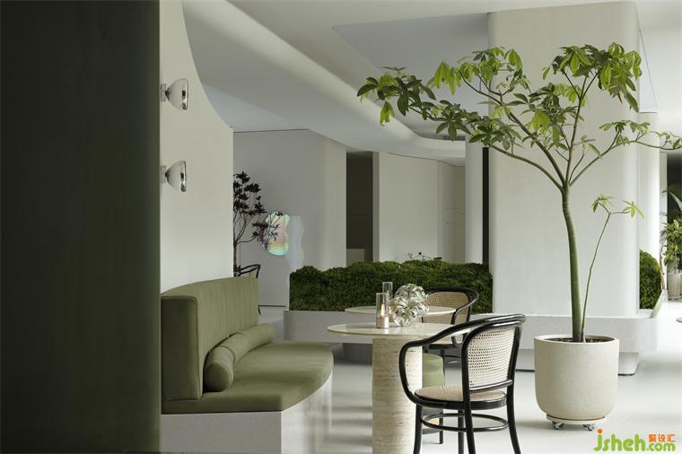 從天花如瀑布傾瀉而下的綠意,室內(nèi)設(shè)計(jì)師配合著交織、閃爍的藝術(shù)燈飾,像點(diǎn)點(diǎn)星光般、像流螢飛舞般,成為水吧區(qū)沉浸式花園體驗(yàn)的重點(diǎn)表達(dá)。