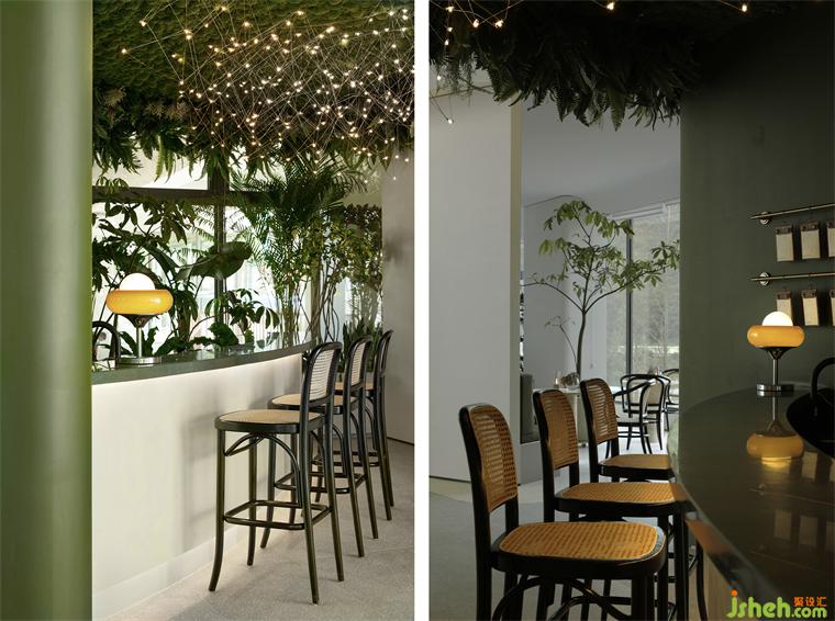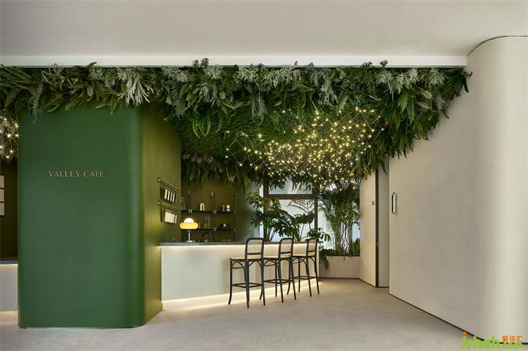 一層的餐廳以“花嶼”為主題, 室內(nèi)設(shè)計師整面數(shù)字花園的智能裝置,為原本安靜、平緩的空間,注入了流動感。暗黑背景的電子屏幕上,花開花謝變得轉(zhuǎn)瞬即逝,映生一種獨特的“室內(nèi)景觀”。