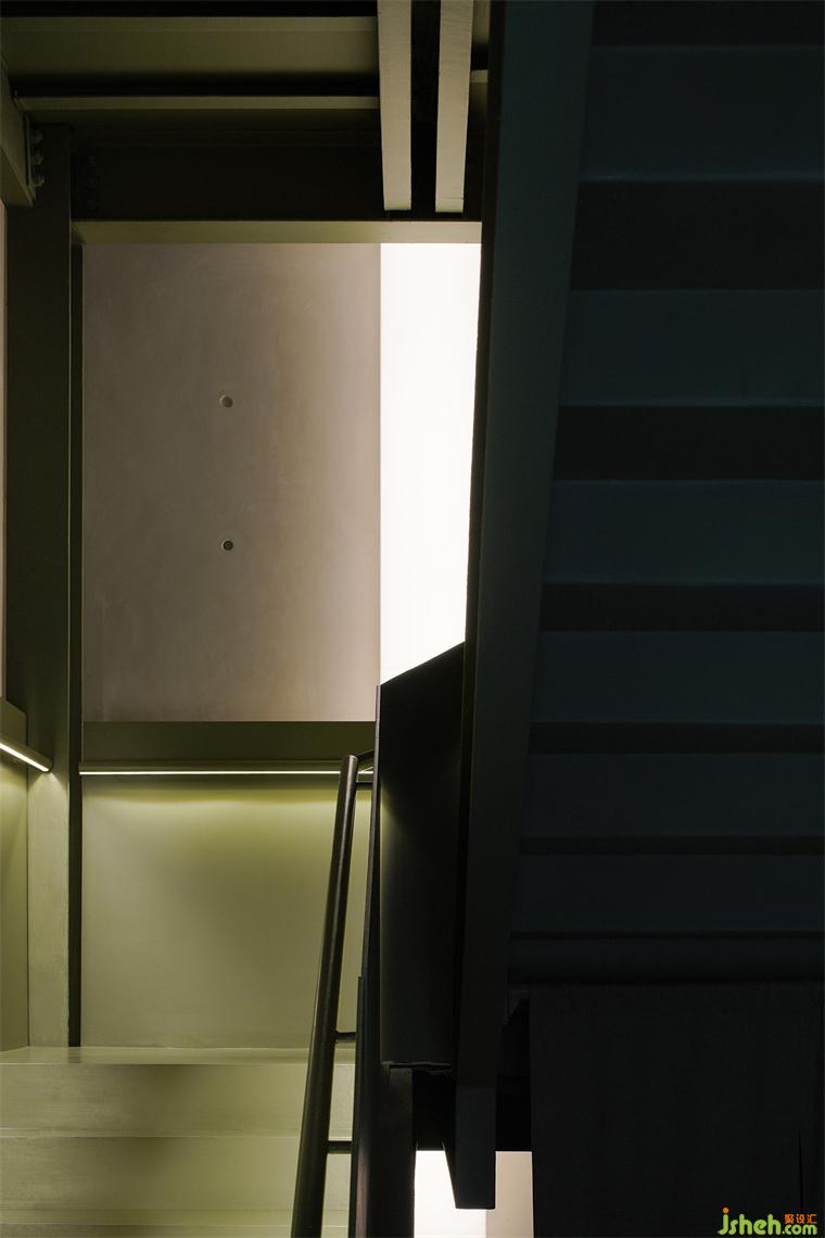 經(jīng)過十號樓東側(cè)餐車外擺區(qū),在燈箱標識的指引下便抵達餐廳的入口。沿著綠色鋼結(jié)構(gòu)樓梯拾級而上,在身體移位的過程中,正對面附墻而上如生命體般的白色發(fā)光箱體在樓梯形體的裁切下,以動態(tài)片段式局部顯露。
