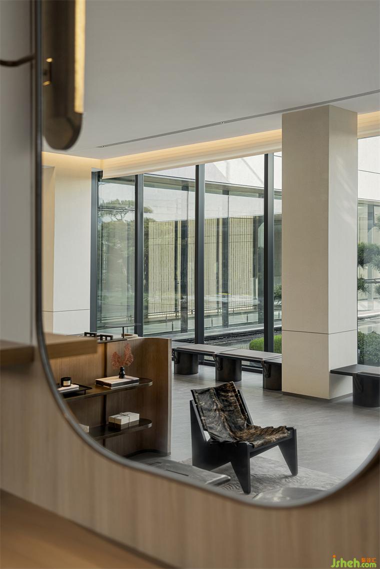 恰如空間環(huán)繞的中央庭院一般,其中的松、石、橋、徑、流水、游魚……都讓人不由得聯(lián)想到此地傳說中的仙山云境。而在這座山海之城,設(shè)計師通過影像、燈光、色彩、材質(zhì)等語言,將“自然之境”納入室內(nèi),裝修設(shè)計令我們得以在當(dāng)下與傳統(tǒng),入世與出世,東方與國際之間自由自在地詩意逡巡。