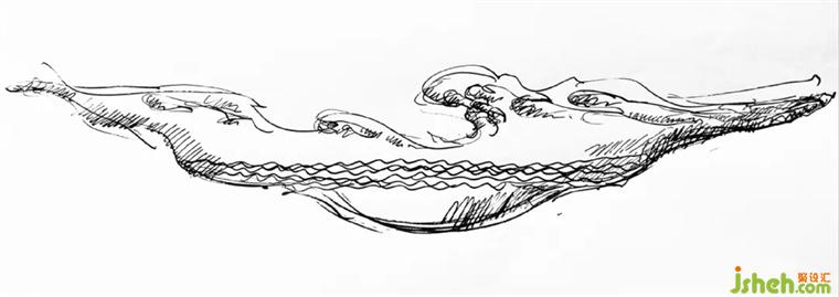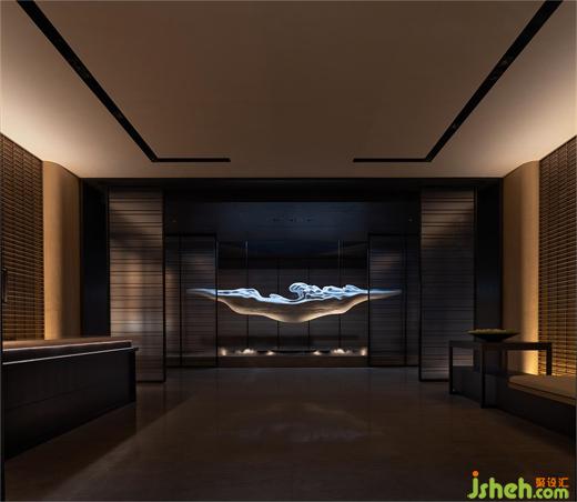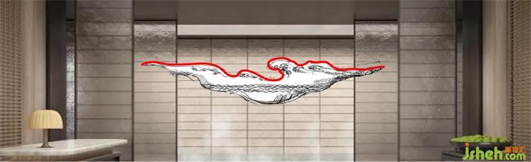 云與浪幻化為船只的形態(tài),含蓄巧妙的對(duì)雕塑本體施以靜謐的負(fù)形水紋,就像船只行駛在水面上,由水面的波光反射到船身處。以間接的表達(dá)來襯托船只在水面上前行,詩意而浪漫。裝修設(shè)計(jì)負(fù)形手法的水紋,在陰陽的變幻之間更彰顯著東方的文化韻味。