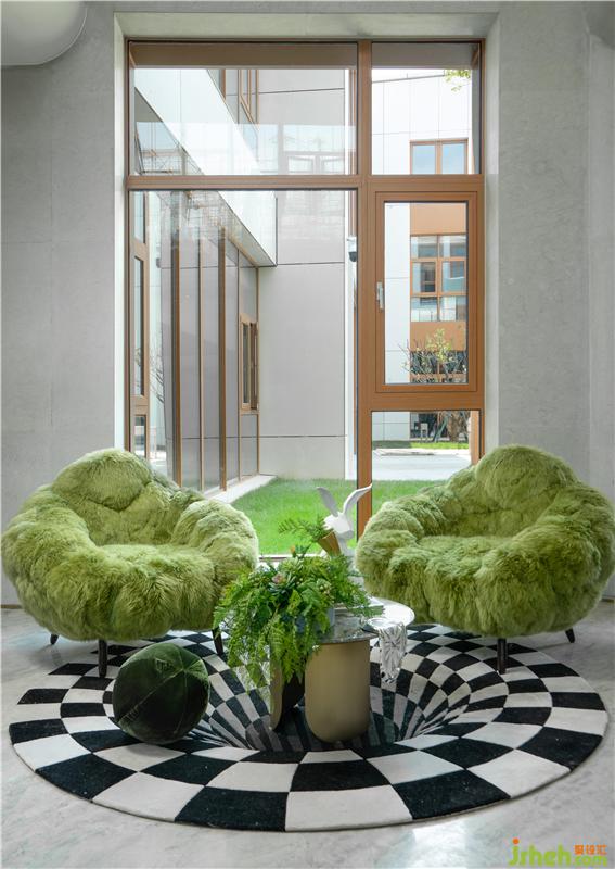 綠色絨毛座椅好似柔軟的青苔,小憩于此,仿佛聞到雨后的清爽氣息。黑白格子組成的地毯仿佛不停下陷,即將墜入另一層夢(mèng)境,是兔子先生的魔法。空間如盤旋交錯(cuò)的夢(mèng),令人游走在真實(shí)和虛幻中。