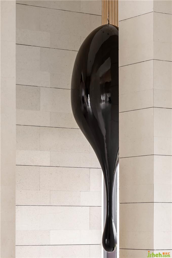 黑色的巨大藝術(shù)雕塑,肅穆而莊嚴(yán),仿佛洞悉著世間萬物輪回的艱辛與沉苦。一墻的半透光景,再點(diǎn)亮萬壑燭光,讓氣闊的空間,多了更多的人生故事與縹緲的視覺氛圍。