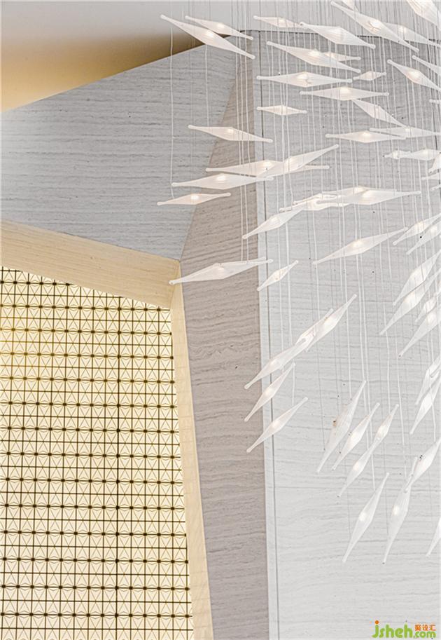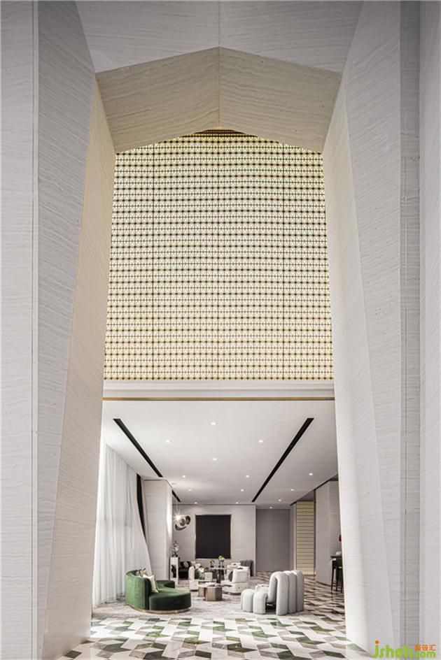 背景通過藝術(shù)品呈現(xiàn)與石材的層次感增強(qiáng)空間的藝術(shù)品位,設(shè)計師通透的金屬屏風(fēng)作為大堂空間分割,使大廳與接待區(qū),兩者看似一體卻又互不干擾,透過燈光折射,仿佛在玩一場光影游戲,干凈剔透又饒富幻變魅力。售樓處設(shè)計