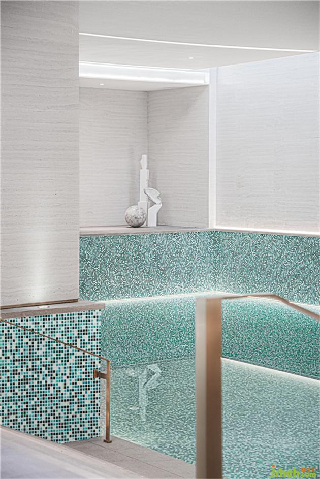 水,象征能量與活力,中國人更將水視為源源不絕的輪轉(zhuǎn)動能。因此設(shè)計師將泳池水景設(shè)計在會所核心的功能區(qū)。在設(shè)計前期WJID與建筑設(shè)計緊密配合,盡可能的將自然天光融入地下空間,改善了地下密室化的局促感。泳池區(qū)域利用馬賽克玩味復古時尚元素,升華海派東方的藝術(shù)氛圍,有如值得細細把玩的珠寶,無論從哪個角度都值得贊嘆。