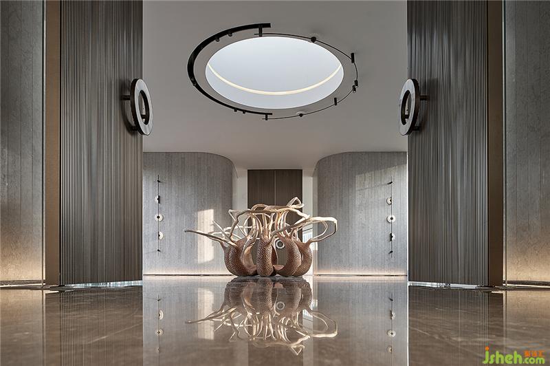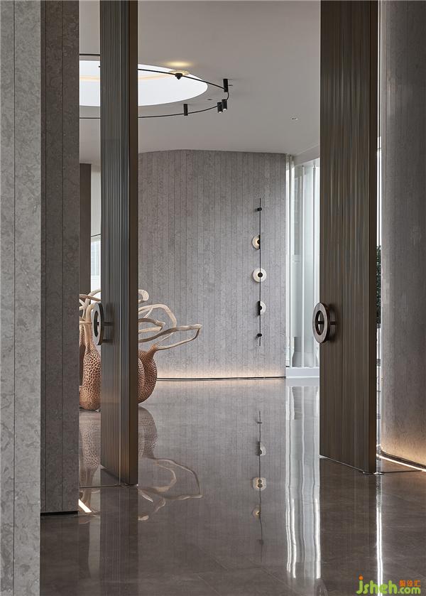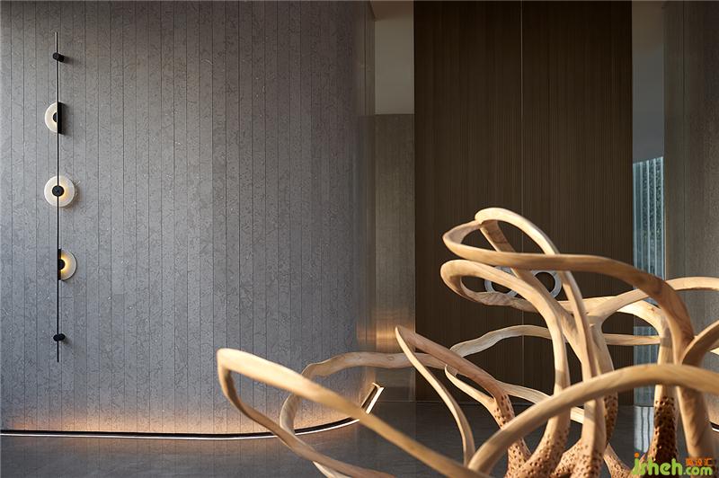 門廳作為入戶的門面,挑高設(shè)計(jì)呈現(xiàn)出天門中斷楚江開(kāi)的磅礡氣勢(shì)。設(shè)計(jì)師透過(guò)圓弧壁面引導(dǎo)動(dòng)線,柳暗花明后進(jìn)入充滿開(kāi)放感的室內(nèi)空間,創(chuàng)造豁然開(kāi)朗的視覺(jué)效果,同時(shí)也反映武漢匯納百川的江湖氣蘊(yùn)。會(huì)所設(shè)計(jì)