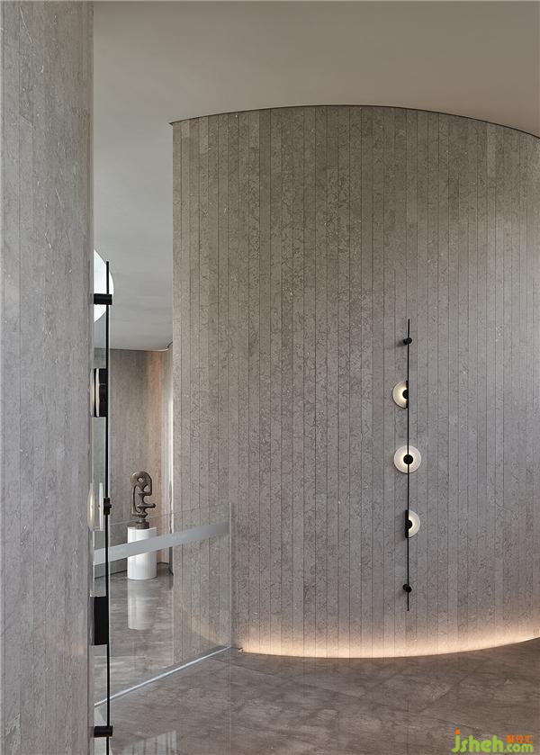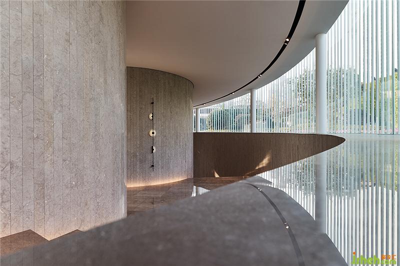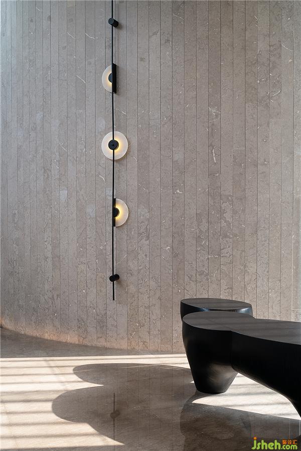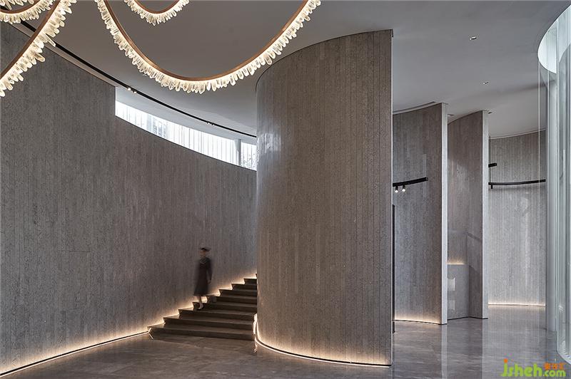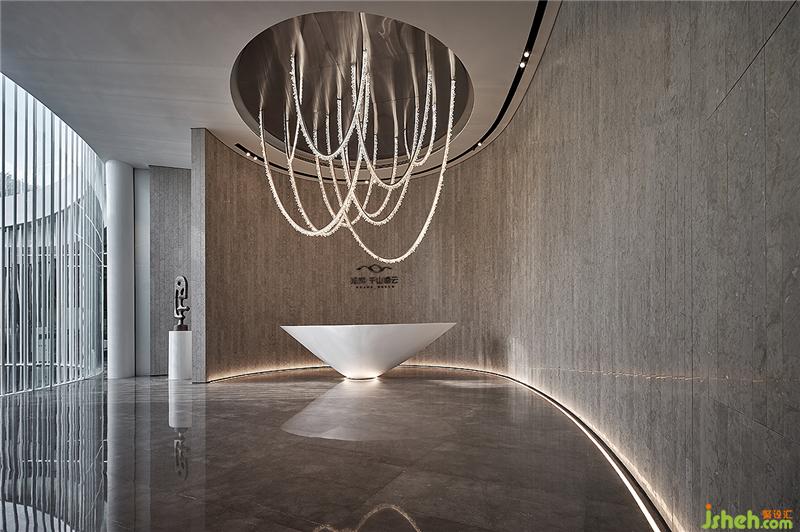 銷控接待臺前,水晶金屬藝術(shù)吊燈勾勒出立體造型,其靈感來自江河水流的曼妙曲線,弧線與弧線彼此串聯(lián)交織,仿彿激蕩飛濺的水花,視覺震撼放大每一位來訪者的感官情緒,將所處空間與自然、人文連結(jié)起來。會所設(shè)計
