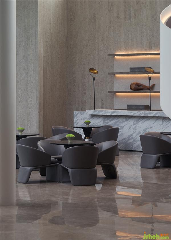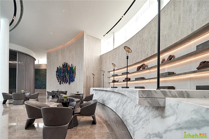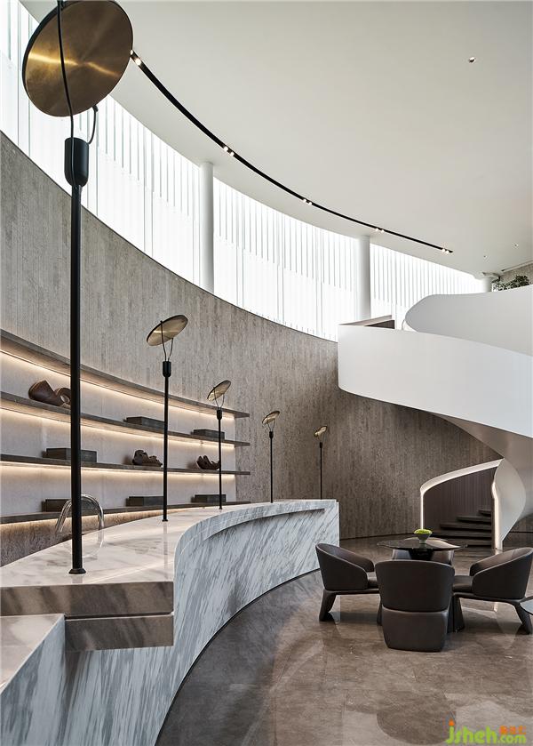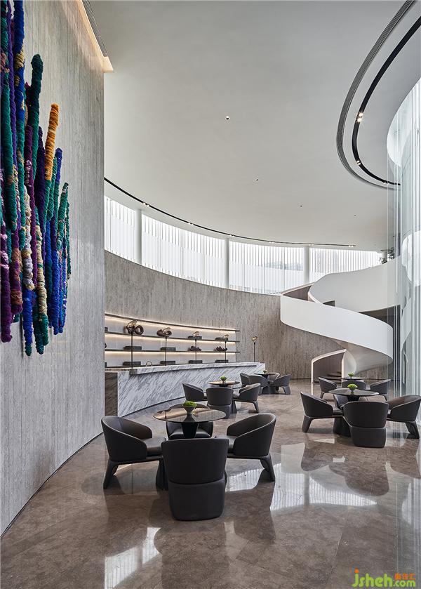接待區(qū)與水吧區(qū)采用開放式景觀樓梯設(shè)計,令人聯(lián)想到水中漩渦,賦予一種圓融、綿延、源源不絕的視覺感受。地磚光澤與墻面相互輝映,去除不必要的陳設(shè)擾動空間通透性,陽光與微風(fēng)自然充盈整個空間。會所設(shè)計