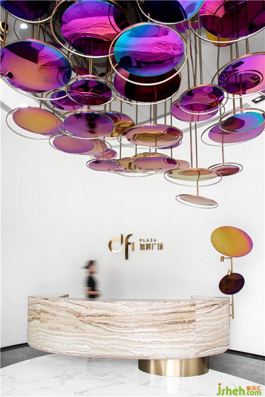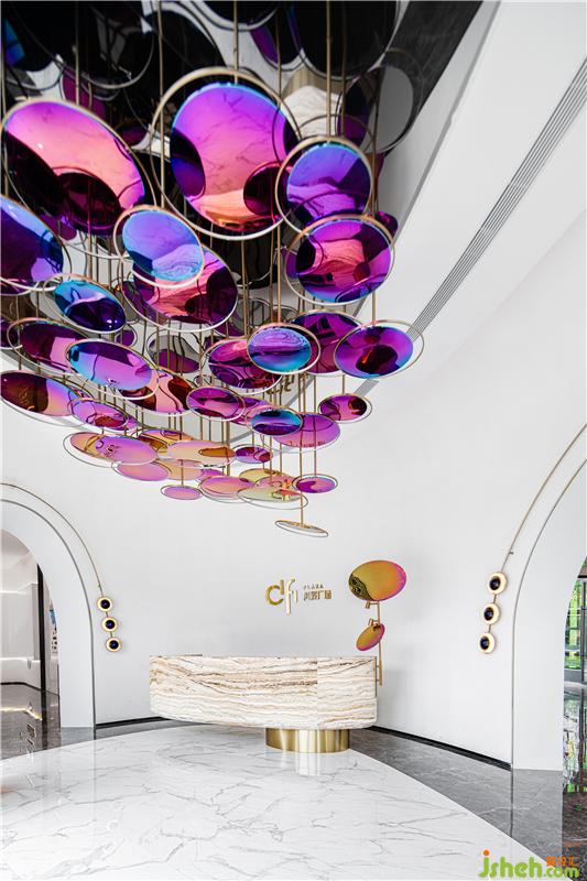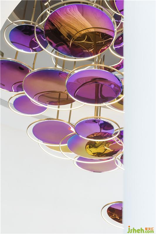 隨處可見的圓環(huán)與弧線,為凝固的空間注入了流動與韻律。像是從屋頂葳蕤生長出來的彩色荷葉,金屬鏡面互相倒影,影影綽綽。絢麗的藍紫色,稀釋了以白色為主調(diào)的前場區(qū)室內(nèi)環(huán)境所帶來的冷清感,而著上了些許夢幻情調(diào)。