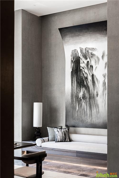 灰色墻面之上,懸掛著一幅意境朦朧又有氣勢的山水畫。畫卷上端微微翹起,增添了一絲虛實(shí)交融的氣息,仿佛有山間微風(fēng)拂過窗欞,輕輕吹起白色窗簾,于是景色也便在這其中,微微搖動。