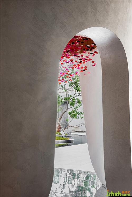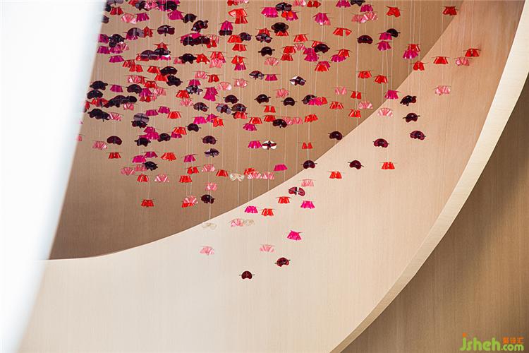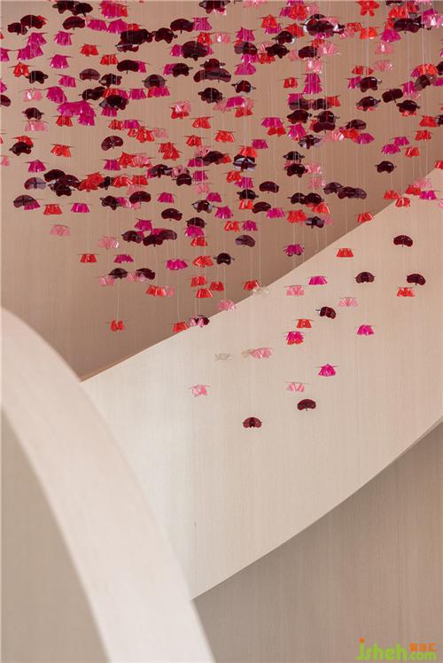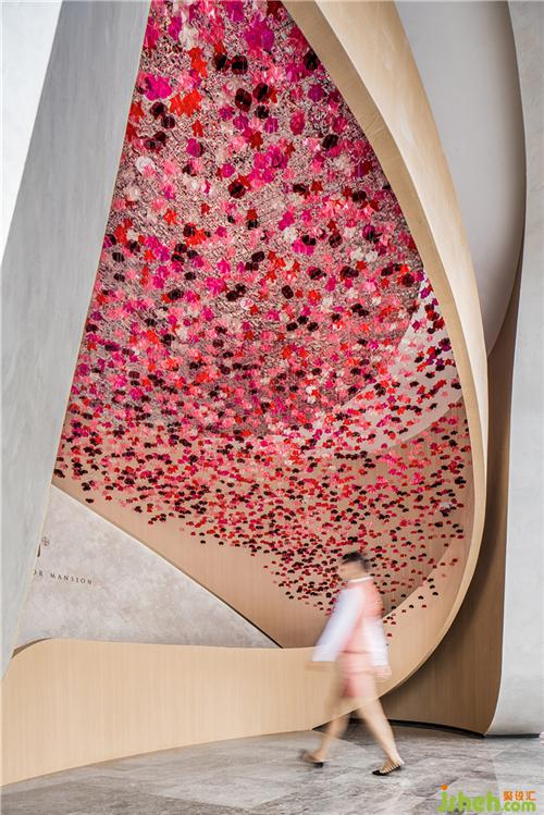 顏色富有層次感的半透明花瓣自頂面垂吊、擁簇,漫天飄灑,輕盈柔軟,閃動著生命的靈動與嫵媚。在自然光的渲染下,開出一片不敗的花海,繁花的豐盈療愈著雙眼。移步換景間,還仿佛能嗅聞到山茶雅致的清香。裝修設(shè)計(jì)