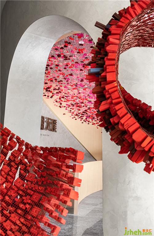 繁花在拱門中半隱半現(xiàn),絢爛與侘寂,在此刻兼而有之,營造出力與美結(jié)合的視野體感??臻g造型以簡約筆法向后場延伸,也打開了下一空間的想象。