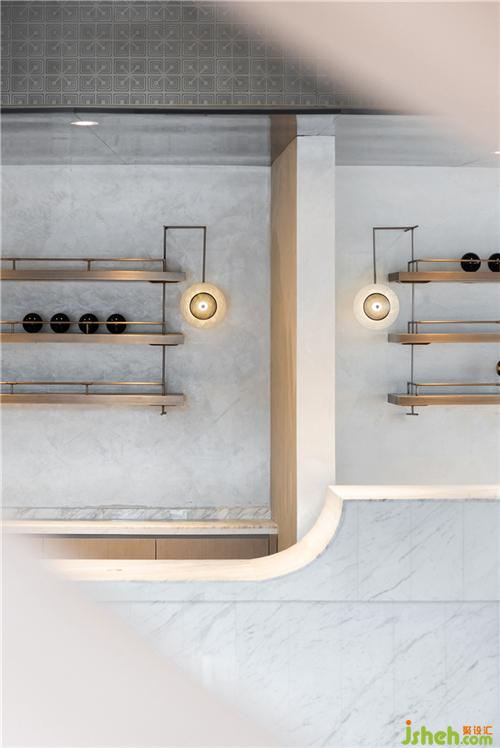 設(shè)計師借鑒現(xiàn)代美術(shù)館的設(shè)計手法,通過點、線、面的交錯與構(gòu)成來表達空間的形態(tài)。圓形壁燈如明珠懸于墻上,與線條流暢的拱門與安謐的灰色墻面相襯,為整個空間籠罩了一層柔潤的光澤。