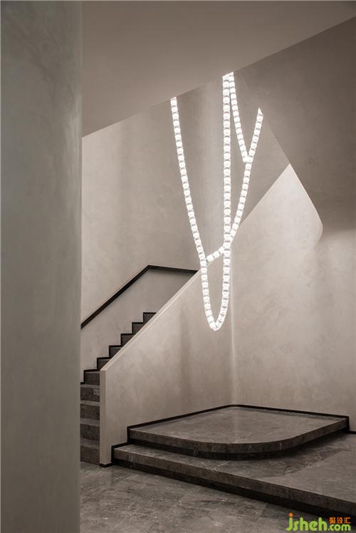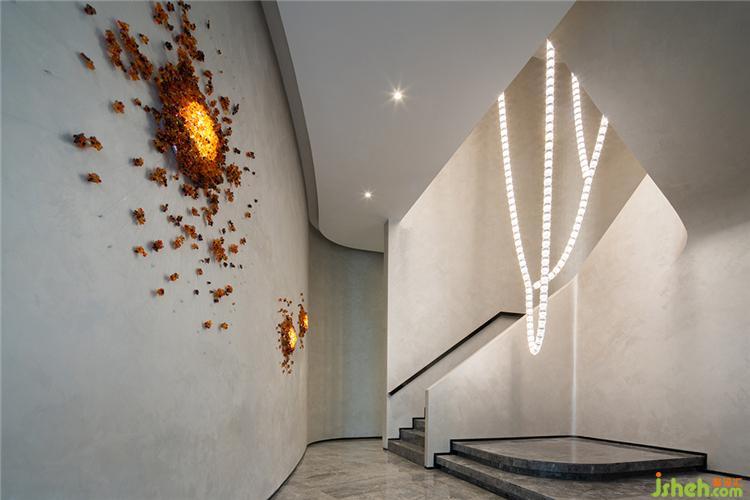 WJID提取硬裝空間的形態(tài)元素,在藝術(shù)長廊盡頭形成垂掛式的藝術(shù)裝置,迎著光與花蜿蜒在墻面,如同城市線條的縮影。