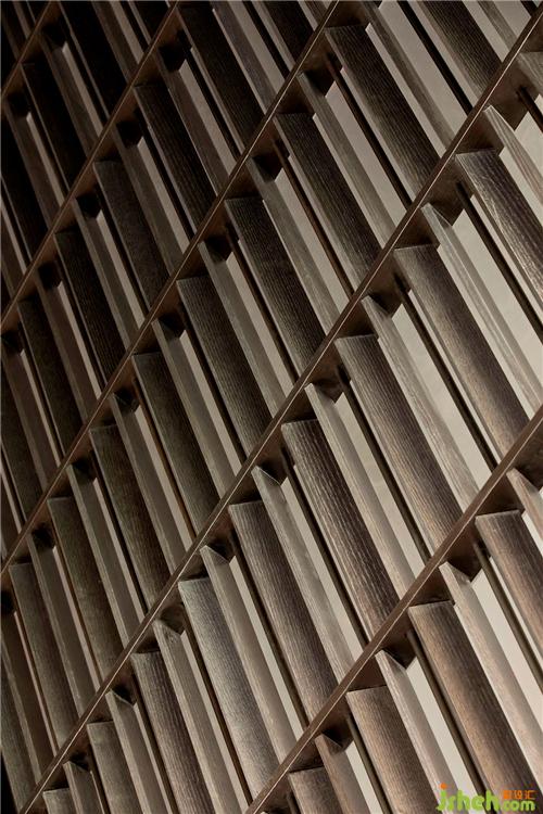 金屬與木質(zhì)拼接的格柵模仿墻體的形態(tài),交錯(cuò)拼接,影影綽綽,于細(xì)節(jié)處形成精巧的結(jié)構(gòu)主義空間。