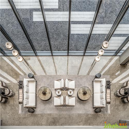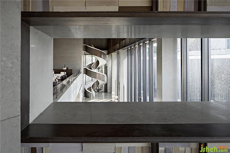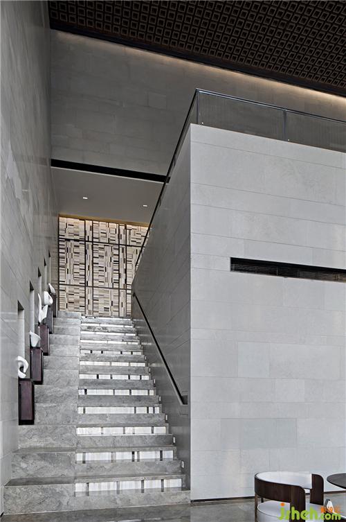 由樓梯轉入一層空間,側面使用篆刻中的陰刻手法刻出扶手,顯示人性溫度的同時,又保有了美學態(tài)度。