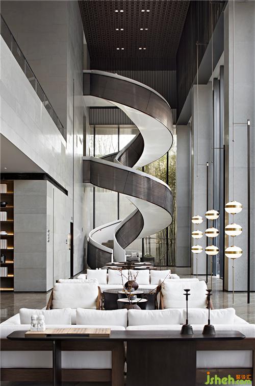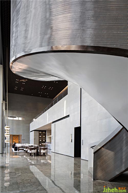 旋轉樓梯如一座極具美感的雕塑,優(yōu)雅的弧形設計給平鋪直敘中增添了韻律,賦予了前廳靈魂。具有當代性的金屬材質在樓梯的運用中,生出了溫潤的東方氣質。
