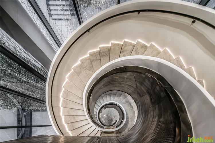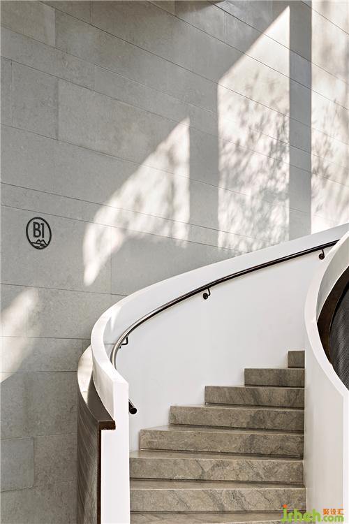 不同視角下,樓梯的線性之美盡顯無(wú)疑。影影綽綽中,猶如山間小徑蜿蜒而下,似動(dòng)非動(dòng),安然而飄逸。