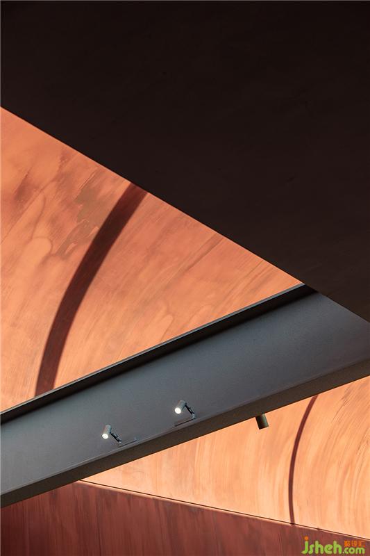 空間的色彩關系在簡潔的形體中顯得更為突出。深色的橫梁與暖色的弧形天花形成了色彩的對撞,創(chuàng)造出了一個寧靜而厚重的室內(nèi)裝修設計空間。