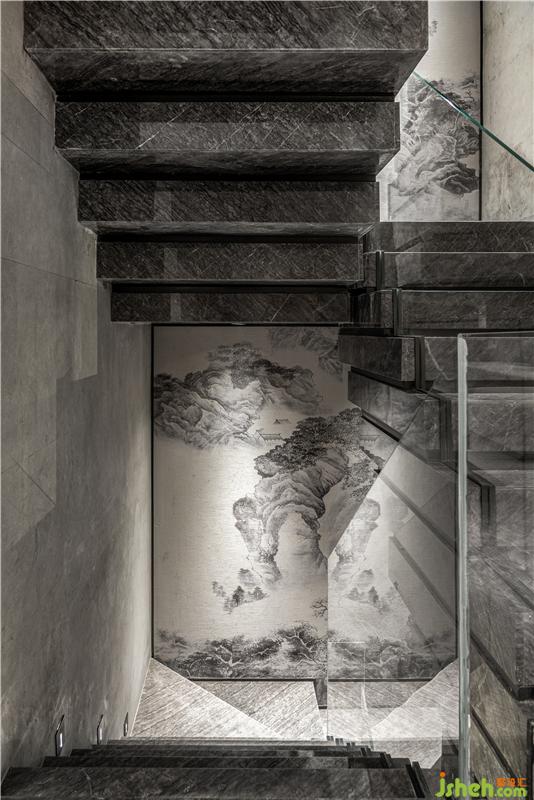 樓梯中是一幅山水景致,趨向簡(jiǎn)淡,然而簡(jiǎn)淡中有著無窮境界。水流傾瀉而下,朗朗山間飛鳥躍過,滿目空山遠(yuǎn),邀請(qǐng)人輾轉(zhuǎn)步入更開闊的天地。