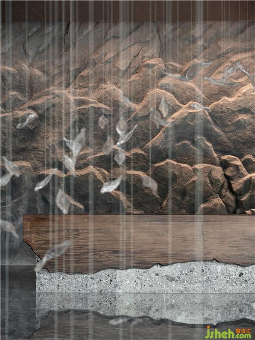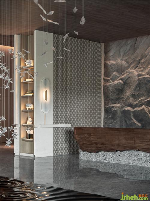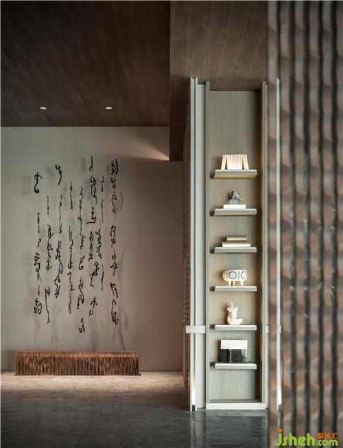 文字元素的「古」與現(xiàn)代技法的「今」相互碰撞交融,極簡(jiǎn)空間因?yàn)閹仔醒笱鬄⒌拇笞指眵攘Γ蟮厣祻浡灤┯谡w空間之中,如身臨山石真境,使人感受舒適、安寧。