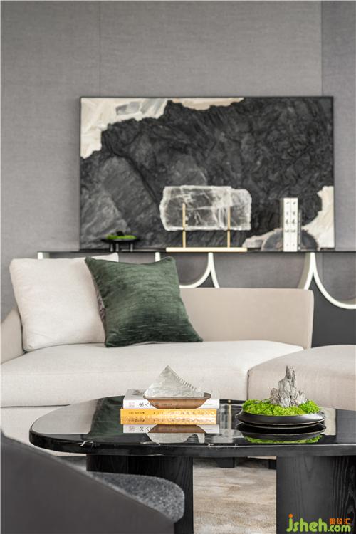 山石元素的大幅藝術(shù)作品寓意深刻,極具感召力,構(gòu)筑如同美術(shù)館一般的微妙空間。