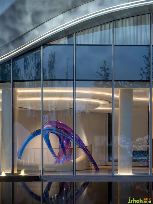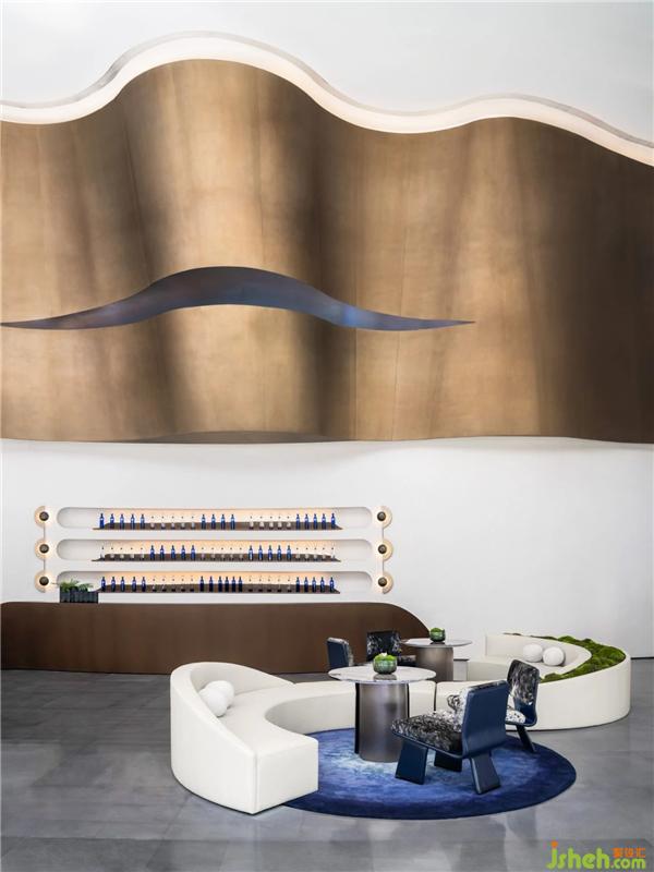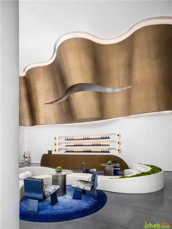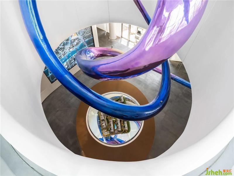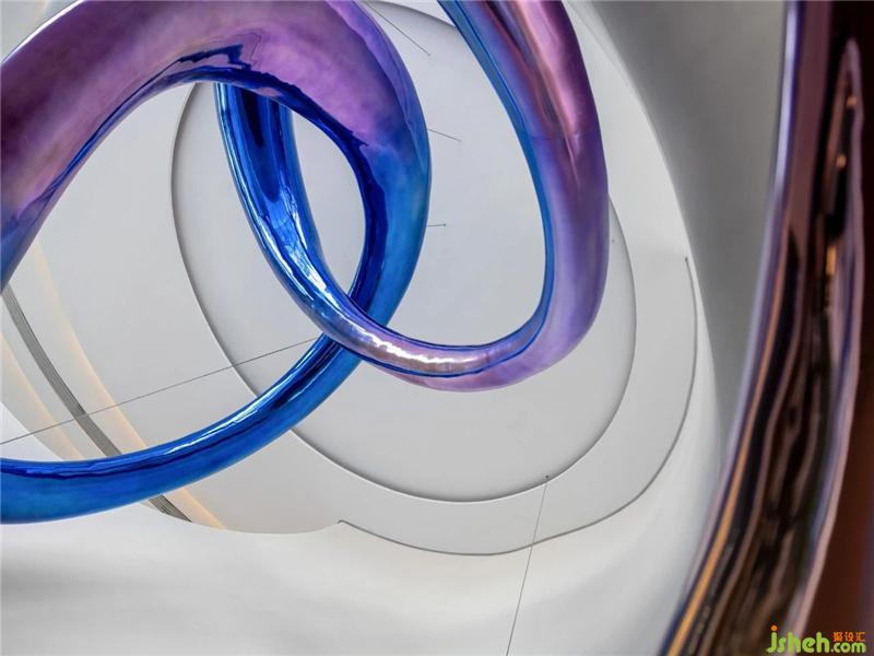 天花空間曲線流麗,意圖展示出一道時(shí)空隱喻,連結(jié)著杭州的過(guò)去、現(xiàn)在、未來(lái)。藝術(shù)裝置「躍升」盤(pán)旋空中,流動(dòng)的態(tài)勢(shì)如滔滔流水,完美衍生出項(xiàng)目地理位置的先天優(yōu)勢(shì)。