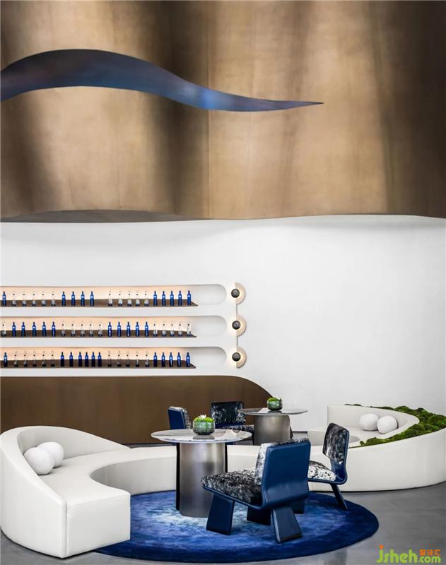 設(shè)計(jì)師攫取水流動(dòng)的形態(tài),以迎賓處入手,進(jìn)行延伸,水流翻涌而下形成涌動(dòng)之勢(shì),在洽談空間彌漫、展開(kāi)。旋轉(zhuǎn)樓梯流動(dòng)、綿延,將空間柔化,形成輕盈漂浮之境,讓人沉浸于動(dòng)態(tài)與變化感之中。