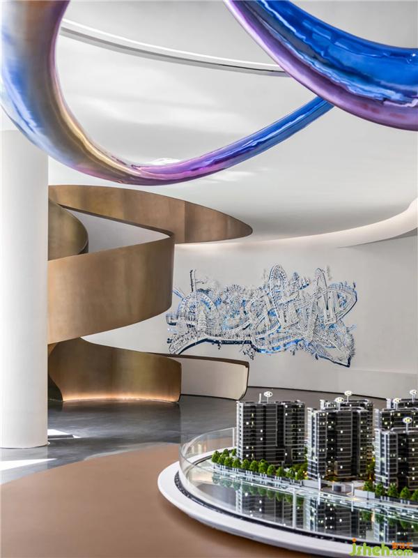 沙盤(pán)區(qū)的整體構(gòu)造完美承接空間形態(tài),形成一個(gè)自洽的環(huán)形區(qū)域,使觀覽動(dòng)線更為流暢,游覽視角更為隨心。曲面使空間柔化而充滿形態(tài)的隱喻,為觀覽者帶來(lái)更多的空間想象杭州售樓處設(shè)計(jì)。