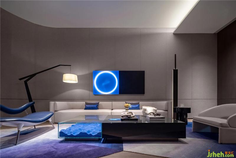 VIP室整體呈現(xiàn)未來(lái)感,設(shè)計(jì)師以一抹灰度為空間定調(diào),極簡(jiǎn)空間強(qiáng)調(diào)現(xiàn)代、科技感。藍(lán)色中一抹圓的藝術(shù)裝置成為視覺(jué)中心,像一個(gè)時(shí)間蟲(chóng)洞,引人順著光的指引,在時(shí)空的隧道中旅行。