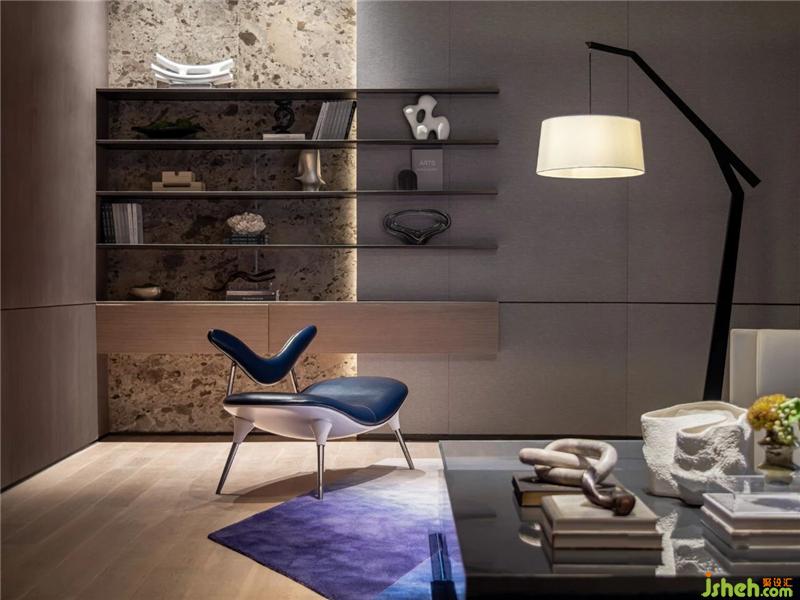 墻面擱架以細(xì)線條呈現(xiàn),上面擺放著書(shū)籍、藝術(shù)裝飾。強(qiáng)調(diào)造型工藝的臺(tái)燈立于一角,烘托著空間的氛圍。沉浸于靜謐的流動(dòng)時(shí)光,簡(jiǎn)單的閱讀空間亦可成為歇心之地。