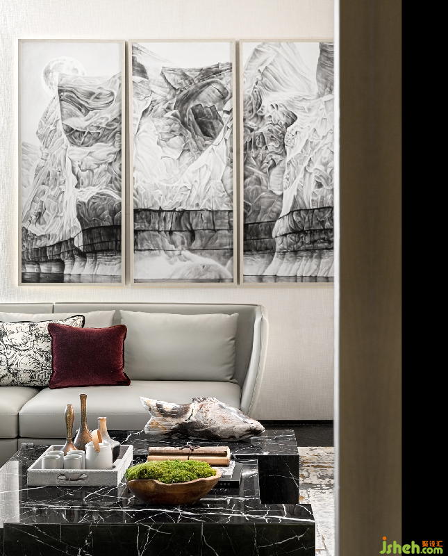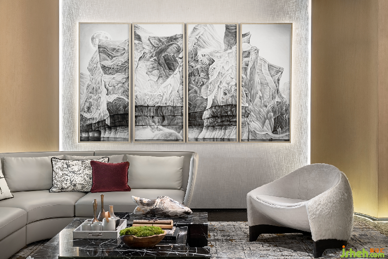 現(xiàn)代抽象畫(huà)的選取將簡(jiǎn)潔的空間大肆潑墨,宛如呈現(xiàn)嶙峋山體,尤為匹配城市紳士的獨(dú)有氣韻。