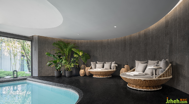 空間功能形態(tài)多元。戲水池空間與戶(hù)外景觀融為一體,休閑與舒緩中,得以與自然實(shí)現(xiàn)能量交換。天花切割形態(tài)柔美,帶來(lái)局部光照的調(diào)和。
