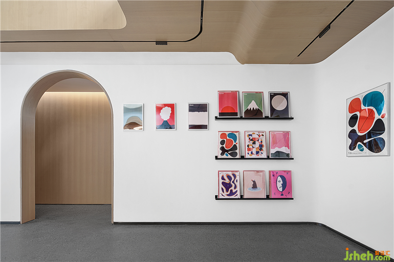 展廳空間頂面玻璃天花落入自然光,削弱地下空間的閉塞感。這也是兩處空間的貫通,通過藝術(shù)畫作的美術(shù)展陳,主動面向更多訪客。